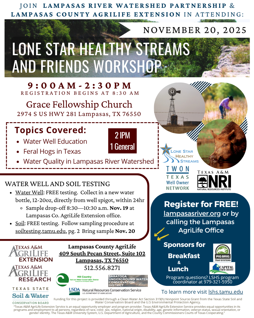 The Lone Star Healthy Streams, LSHS, and the Texas Well Owner Network, TWON, are hosting a whole watershed approach that allows residents to have their private well water screened, and/or soil samples tested, as well as provide education training for groundwater and surface water protection. This event is hosted by the Lampasas River Watershed Partnership, Texas A&M AgriLife Research and Texas A&M AgriLife Extension. This event is open to the public and through several sponsors Breakfast AND Lunch provided + earn 2 IPM and 1 General CEU